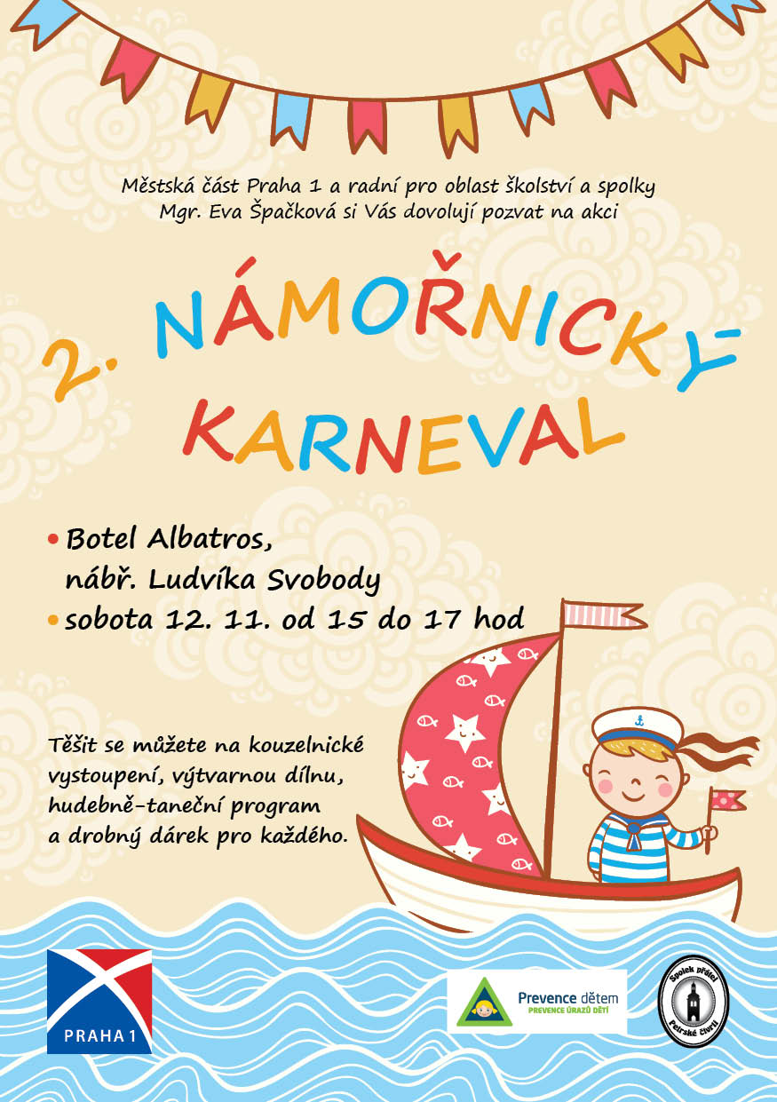 Městská část Praha 1 ve spolupráci se Spolkem přátel Petrské čtvrti a spolkem Prevence dětem pro Vás připravila 2. námořnický karneval, který se koná v sobotu 12. listopadu od 15 do 17 hod na botelu Albatros, nábřeží Ludvíka Svobody. Přijďte, těšíme se na Vás!