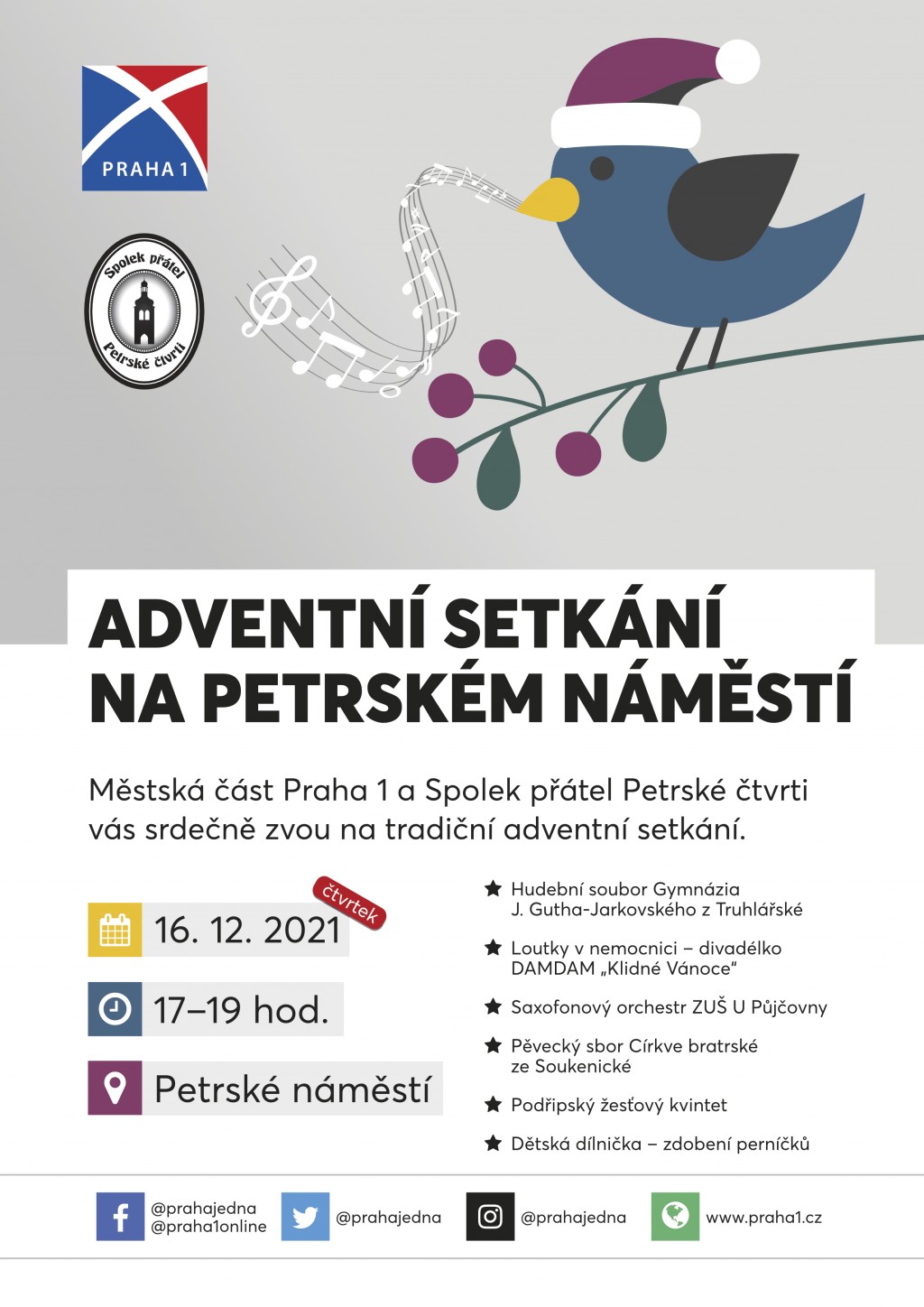 Milí sousedé, i letos zakončí cyklus Adventních zpívání naše Adventní setkání na Petrském náměstí, a to ve čtvrtek 16. prosince od 17 do 19 hod. Těšíme se na shledání s Vámi.